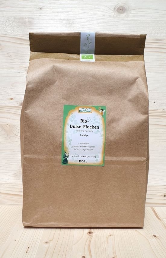Unbehandelt, luftgetrocknet bei 30 Grad, biozertifiziertBio-Dulse-Algen in Flockenform sind Rotalgen und können hervorragend pur und trocken gegessen werden, z.B. als Beilage zu ungesalzenen Salaten, Nüssen, Karotten, Rohkostbroten. Bio-Dulse-Flocken verfeinern z.B. einen leckeren Krautsalat und machen ihn würziger. Der Geschmack erinnert etwas an getrockneten Schinken.