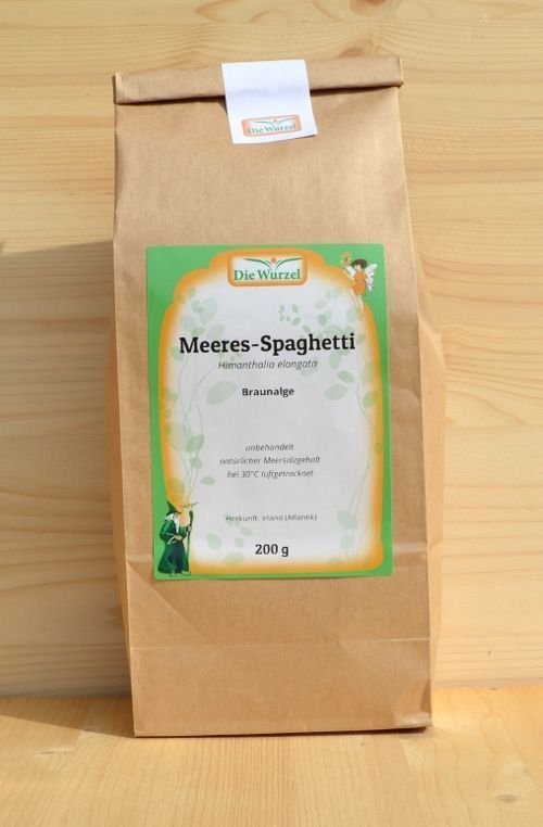 Hinweis: Tägliche Aufnahmeempfehlung der DGE: 200 µg Jod. Dies entspricht 1,4 g getrocknete Bio-Meeres-Spaghetti. Abwaschen, Einweichen oder Kochen reduziert den Jod- & Salzgehalt erheblich.